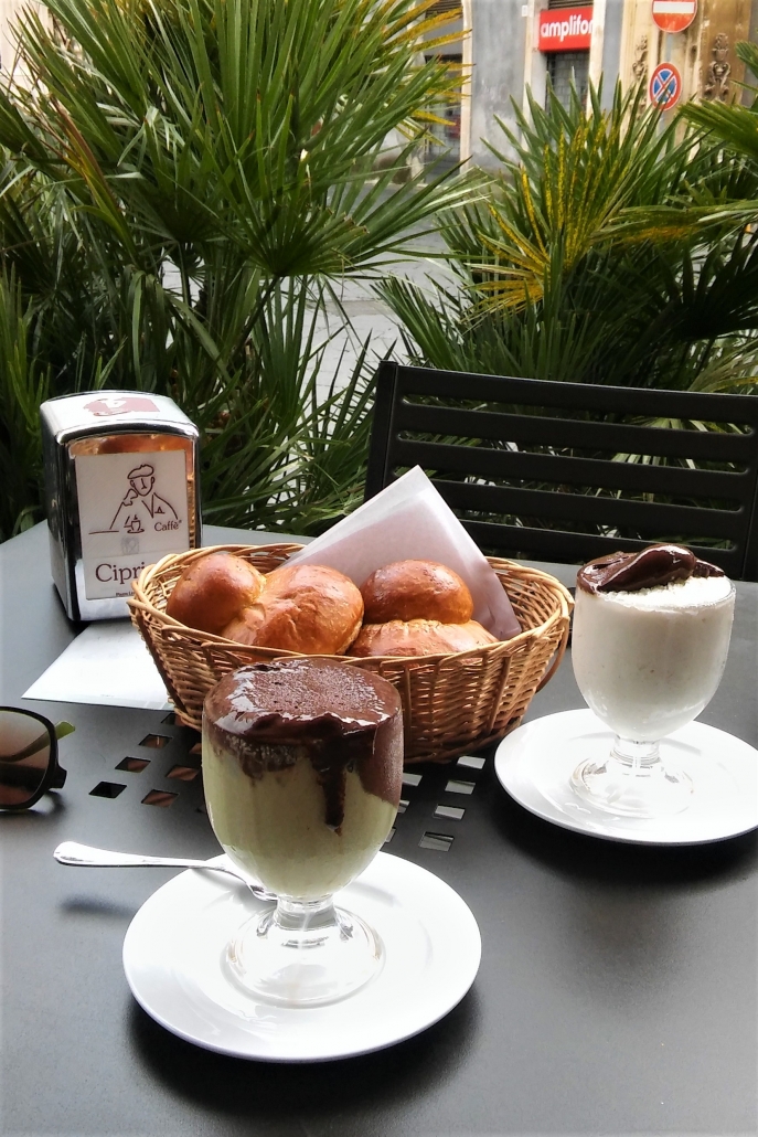 In Sicilië is een granita ‘s zomers een welkom ontbijt. Er wordt een warme brioche bij geserveerd en de combinatie van het ijs met een warm broodje is echt een aanrader! Vaak worden combinaties van smaken besteld: de favoriet van mijn man is bijvoorbeeld amandel met een klein beetje koffiesmaak eraan toegevoegd. Een pistache granita met chocolade is ook heerlijk.
